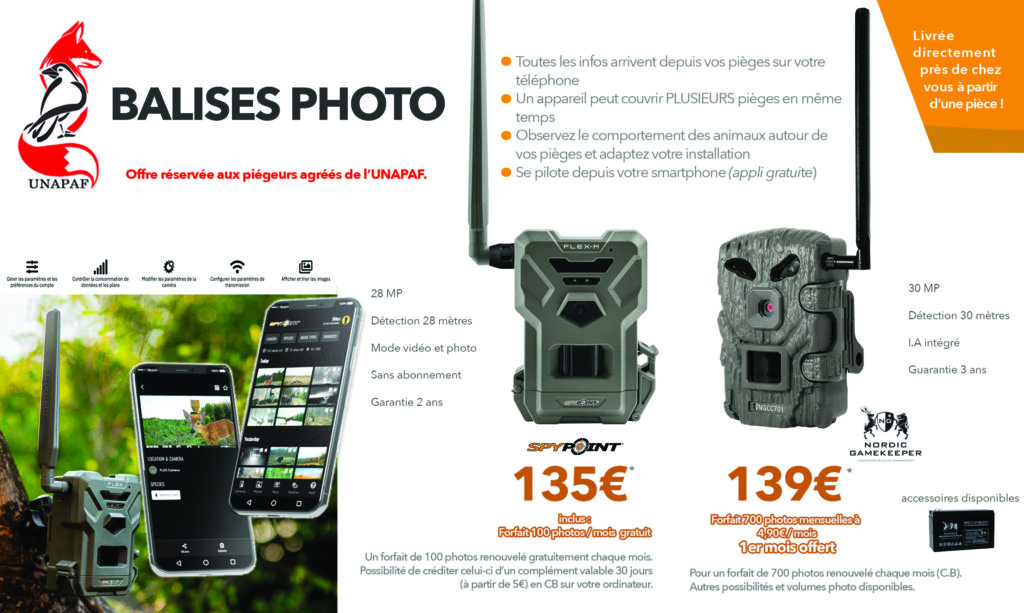 Lancé à l’automne dernier, ce produit représente un avantage énorme pour vos adhérents-piégeurs. L’appareil vous envoi une photo directement sur votre téléphone, qui indique la date et l’heure. Vous savez si il y a prise et de quelle prise il s’agit. Pas de déplacement urgent en cas de déclenchement intempestif. Mieux : observez le déplacement des animaux autour de votre piège, et adaptez votre installation pour le rendre encore plus performant.